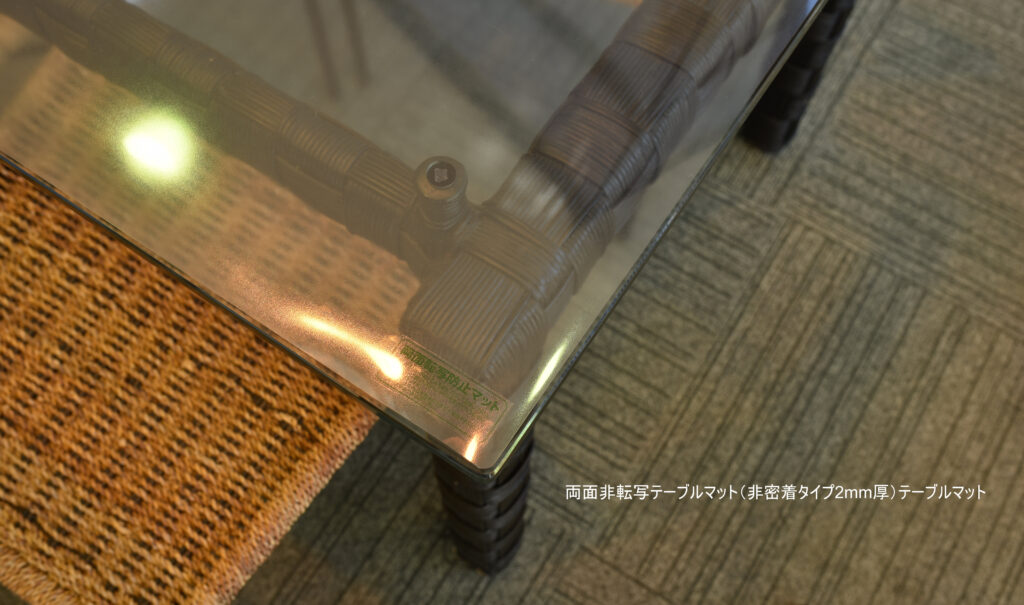 当店がガラステーブル用におすすめしているのは、裏面に微細な凹凸加工を施した**「両面非転写テーブルマット(非密着タイプ2mm厚)」**です。