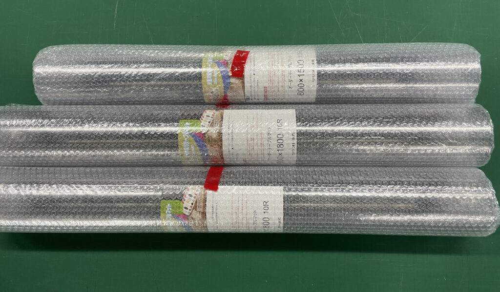 まずは、丸めたマットを**「プチプチ(緩衝材)」**で隙間なく包み、配送中の衝撃から守ります。