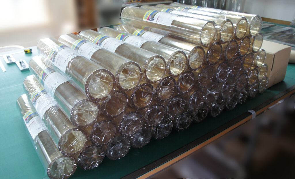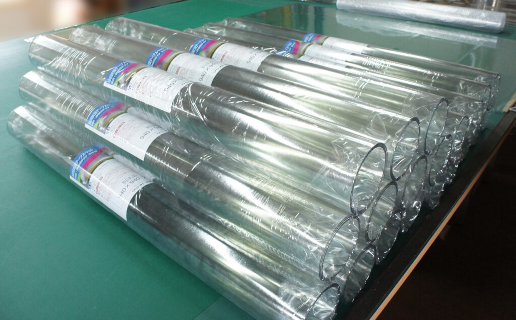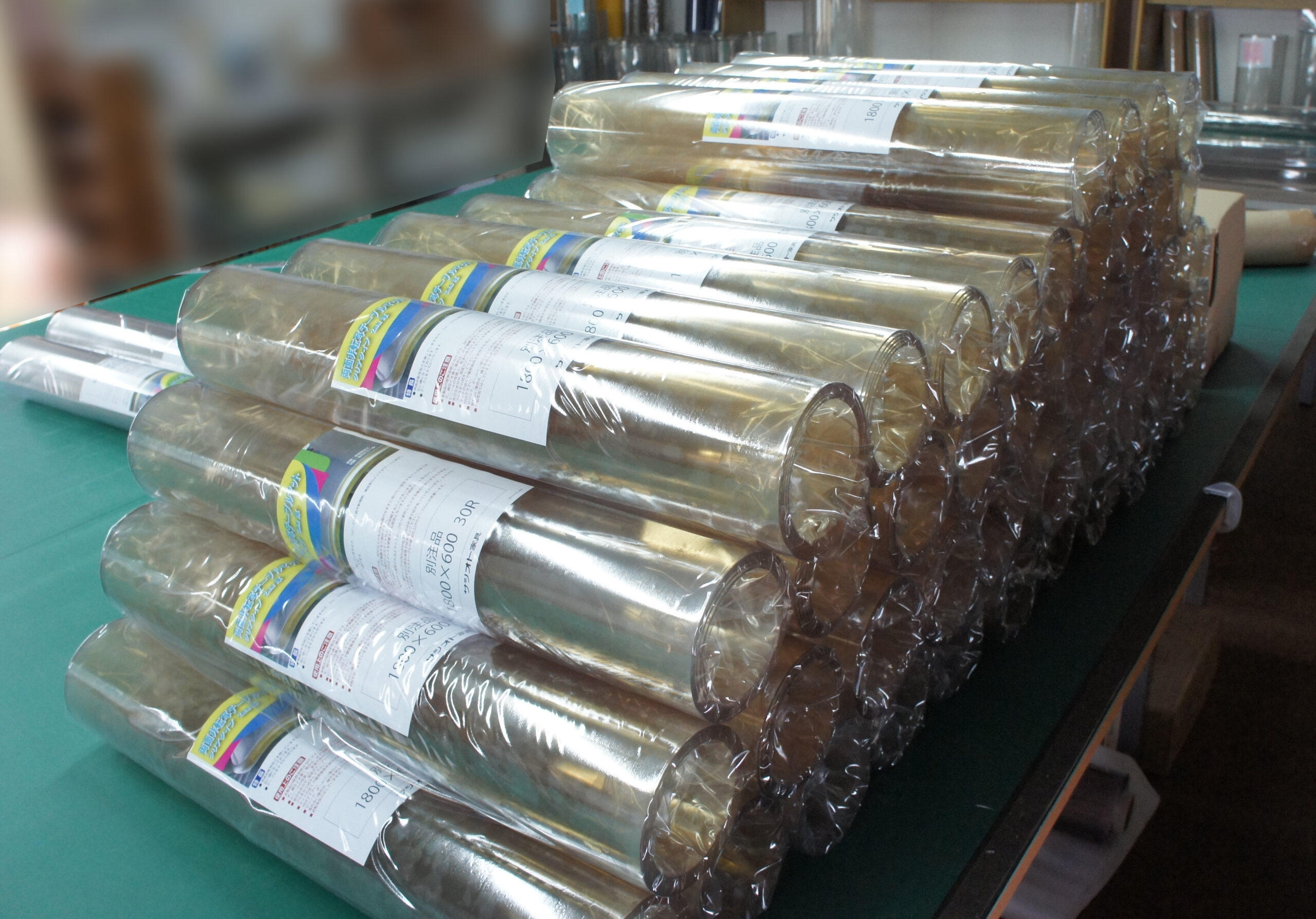 イベントや展示会などでは、テーブルの汚れ防止はもちろん、会場の清潔感を保つために透明マットは欠かせません。 これだけの枚数であっても、熟練の職人が一枚一枚、サイズに狂いがないよう丁寧にカットしております。