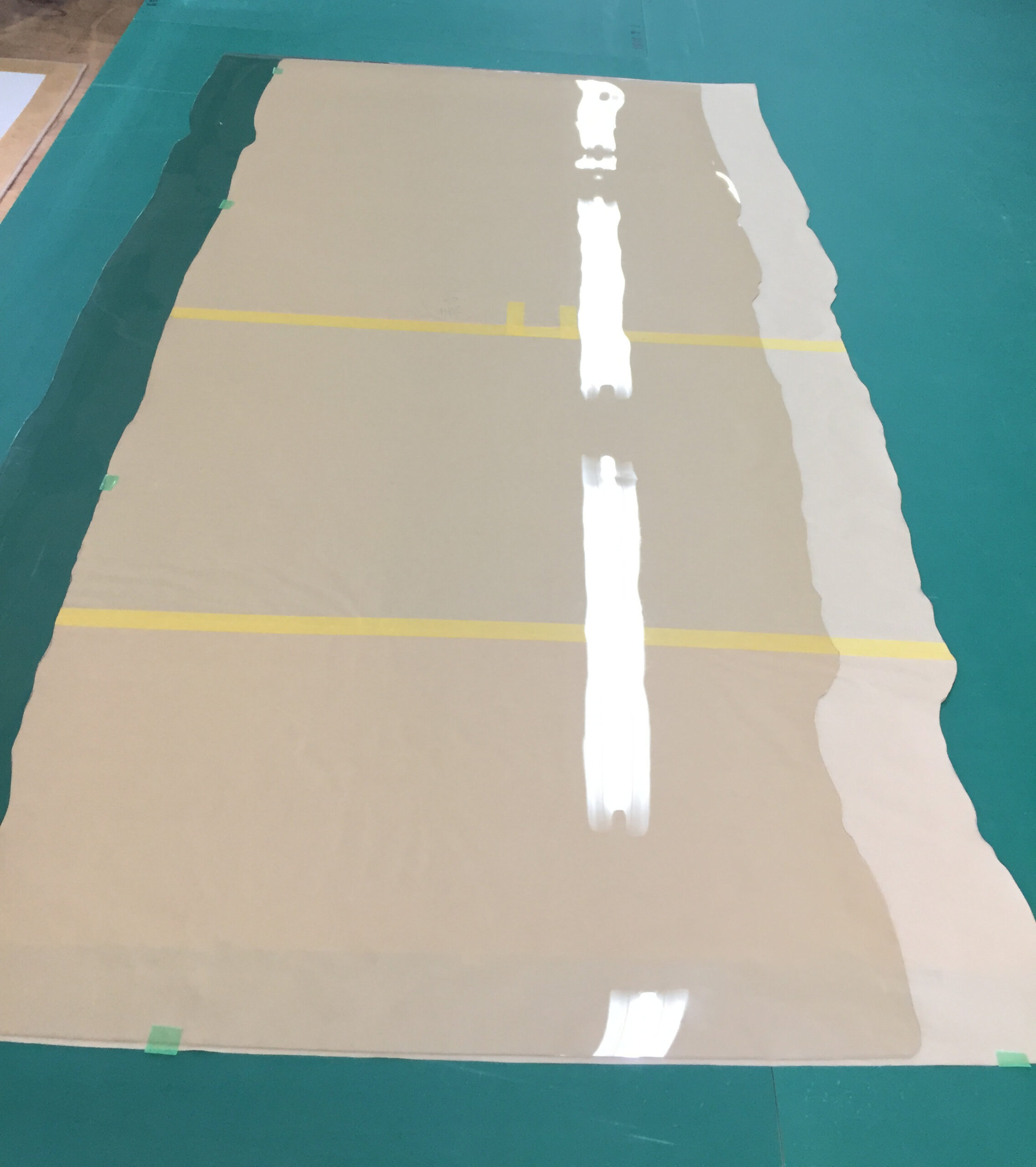 お客様のテーブルは、長辺部分に丸太の表皮に近い自然な波打ちを残した「耳付き」と呼ばれる形状です。 スパッと直線にカットされた短辺とは異なり、この長辺のうねるような複雑な曲線に合わせてマットを作るのは、実は簡単なことではありません。