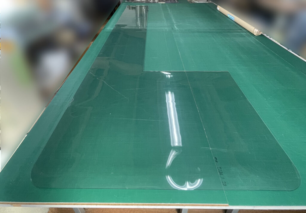 こちらが、1800mmロールから切り出した製作中の様子です。 作業台を埋め尽くすほどのサイズ感!このような規格外の特大サイズを、継ぎ目なしの美しい一枚のマットとして仕上げられるのが、【透明テーブルマット専門店】サシオト家具の大きな強みです。