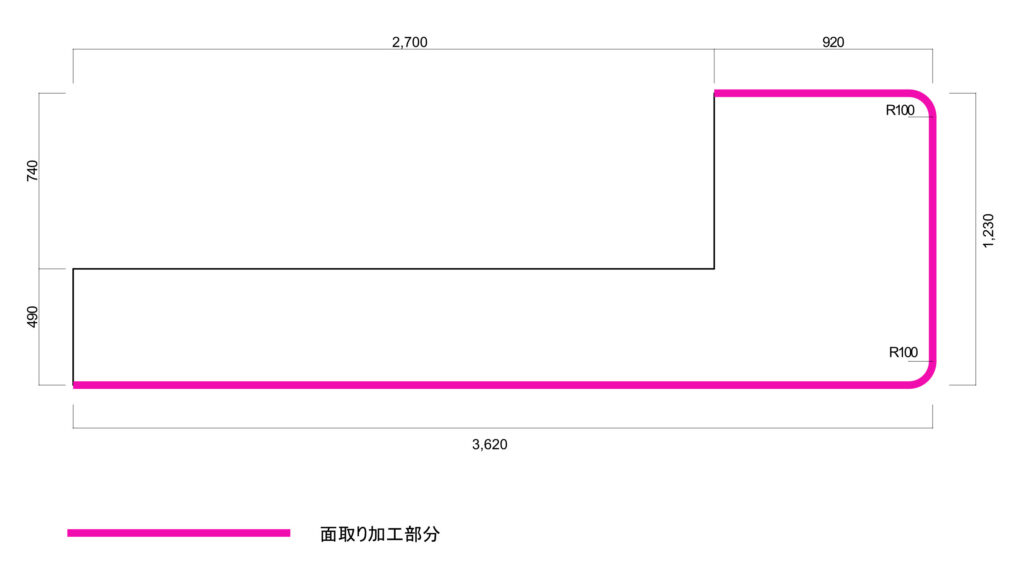 最後に、図面でご指定いただいた「面取り加工」と「R100(半径10cmの丸み)」の仕上がりをご覧ください。