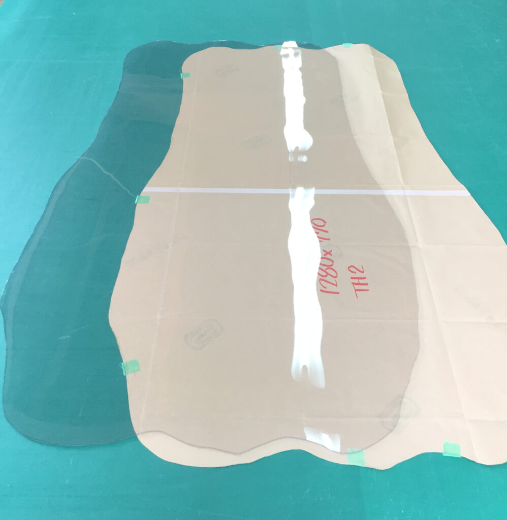 届いた型紙に合わせて、マットをカットしていく作業です。 ご覧の通り、見事なまでに「複雑な曲線ばかり」です。刃を入れる角度、カーブの強弱、少しの狂いも許されない、職人として最も気が抜けない緊張の瞬間です。