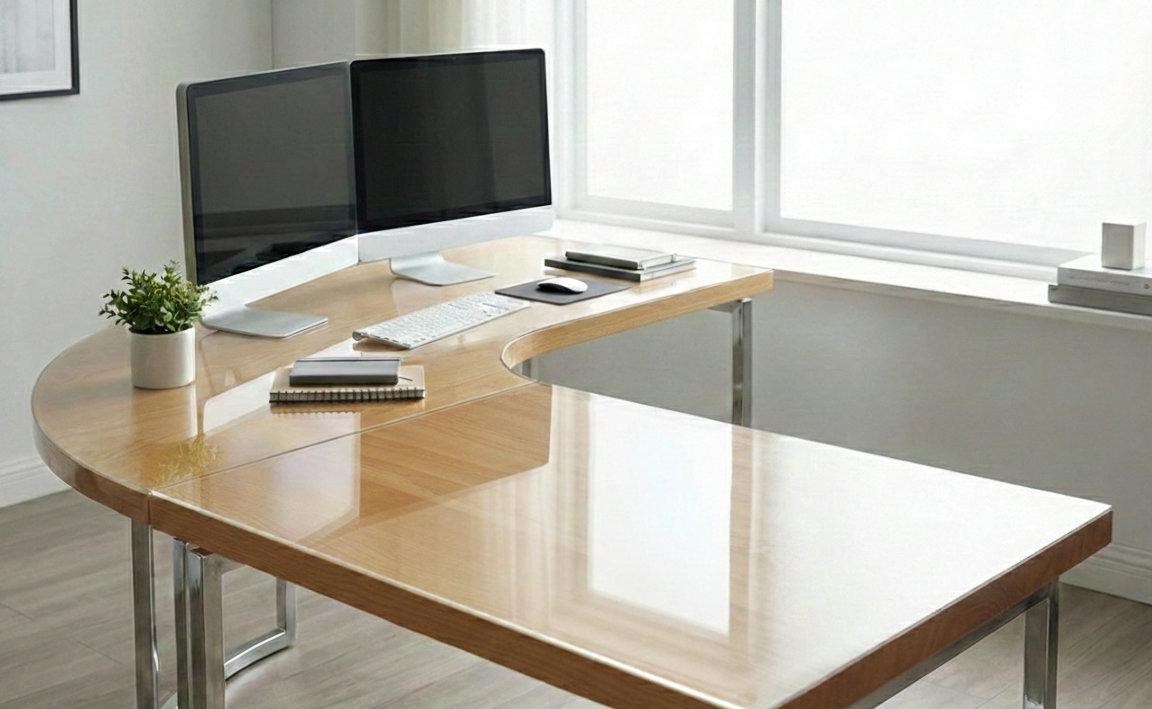 納品事例・お知らせ 【L字型デスク】既製品にはない「パソコンデスク用マット」も型紙から作成します